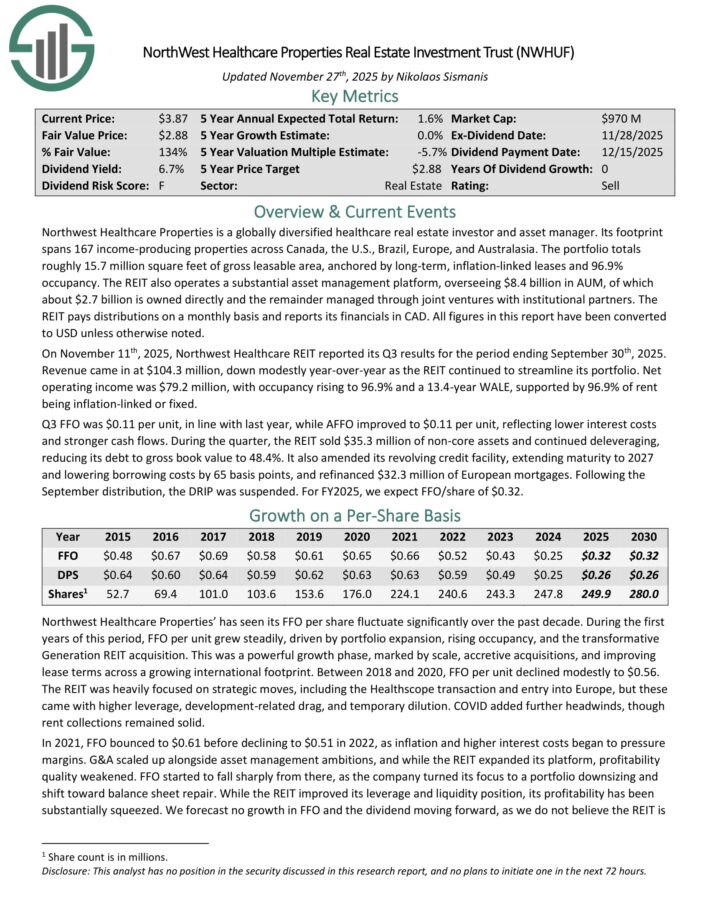 On November 11th, 2025, Northwest Healthcare REIT reported its Q3 results. Revenue came in at $104.3 million, down modestly year-over-year as the REIT continued to streamline its portfolio.