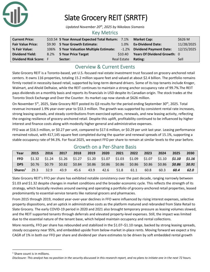 Slate Grocery REIT is a Toronto-based, yet U.S.-focused real estate investment trust focused on grocery-anchored retail centers. It owns 116 properties, totaling 15.2 million square feet.