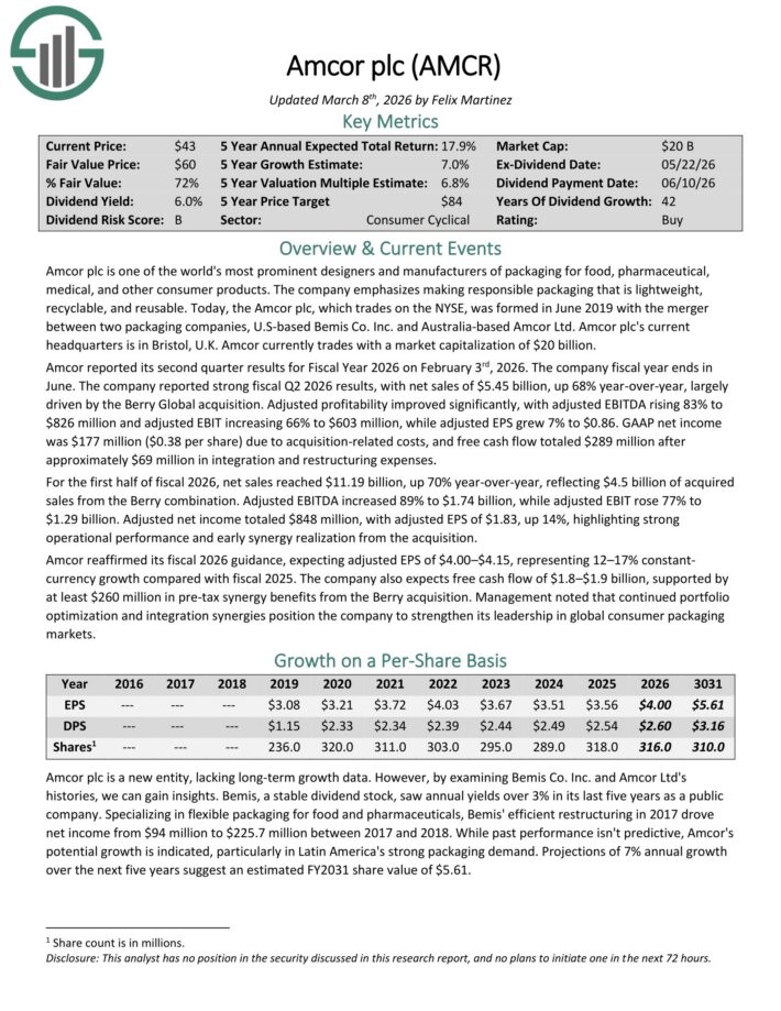 Amcor reported its second quarter results for Fiscal Year 2026 on February 3rd, 2026. The company reported strong fiscal Q2 2026 results, with net sales of $5.45 billion, up 68% year-over-year, largely driven by the Berry Global acquisition.
