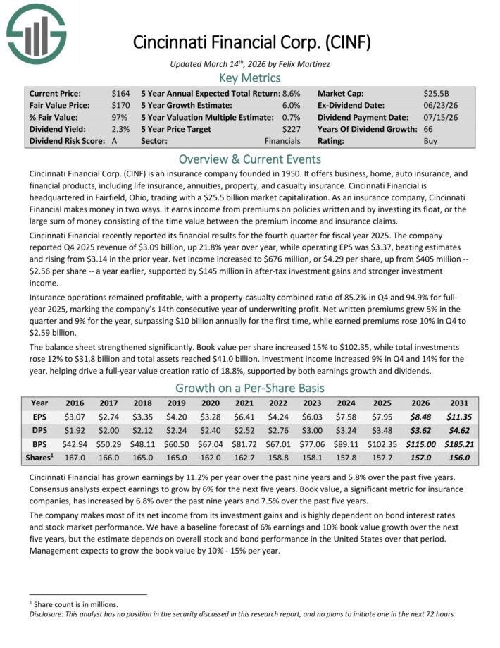 Cincinnati Financial is an insurance company founded in 1950. It offers business, home, auto insurance, and financial products, including life insurance, annuities, property, and casualty insurance.