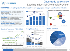 The company reported record full-year 2025 results, with revenue of $1,997.8 million (+11.8%) and adjusted EBITDA of $507.4 million (+7.8%). Net earnings rose to $139.4 million, and distributable cash reached $228.0 million ($1.99 per unit). Growth was driven by stronger pricing and volume growth in key chemical segments, while the balance sheet remained solid, with a 2.3x leverage ratio.