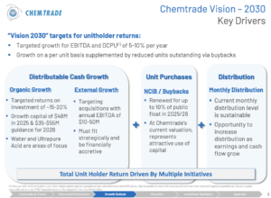 The latter scenario seems more plausible, especially given that interest rates remain high and that Chemtrade’s units already carry an above-average 4.5% dividend yield.