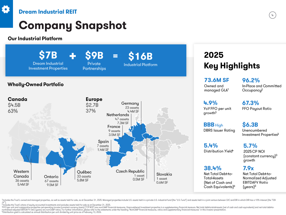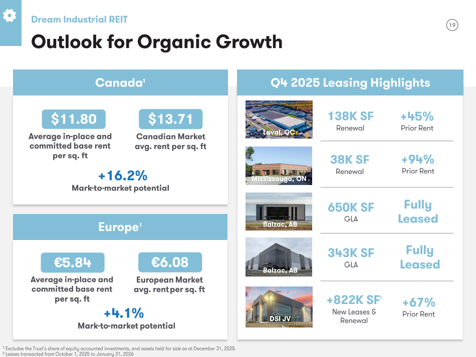 Dream Industrial posted fourth quarter and full-year earnings on February 17th, 2026, and results were better than 2024. Net rental income was up 8.3% year-over-year to $281.1 million, which was attributable to higher comparative properties growth, and contributions from completed development projects. Comparable property net operating income on a constant currency basis was up nearly 6% to $296 million, which was supported by strong leasing momentum and higher rental rates in both Canada and Europe.