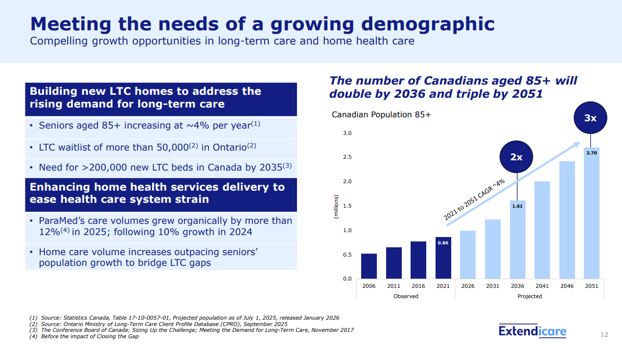 Extendicare is ideally positioned to benefit from a strong secular trend, namely the growing demand for healthcare services. The demand for health care from seniors who are above 85 years old is growing at a rapid rate. Indeed, Extendicare sees that population doubling by 2036, and tripling by 2051.