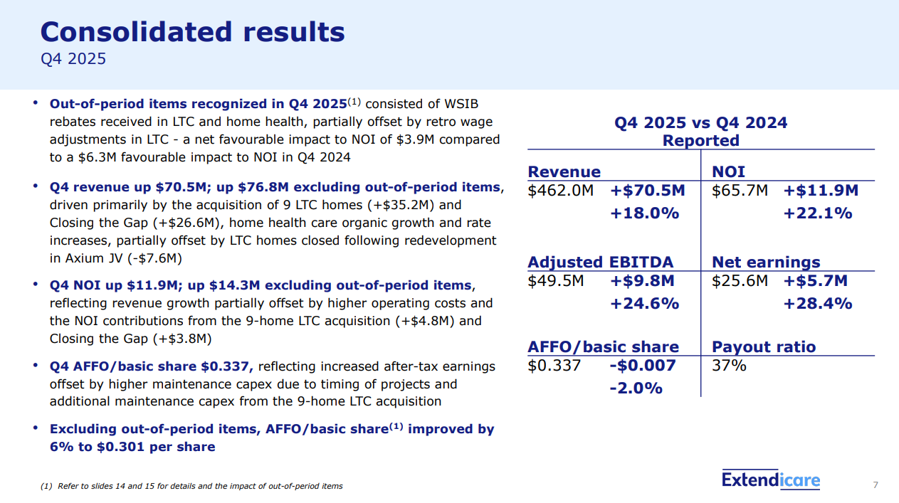 Still, the company has managed to continue to increase earnings. On February 26th, 2026, Extendicare posted fourth quarter and full-year earnings, which were quite good and capped a very strong year. Revenue was up 18% year-over-year to $337 million, with organic growth driving a very impressive 15.7% gain. The balance of growth was due to the net of acquisitions and divestitures. Higher bill rates helped drive organic revenue growth, partially offset by closure of underperforming homes.