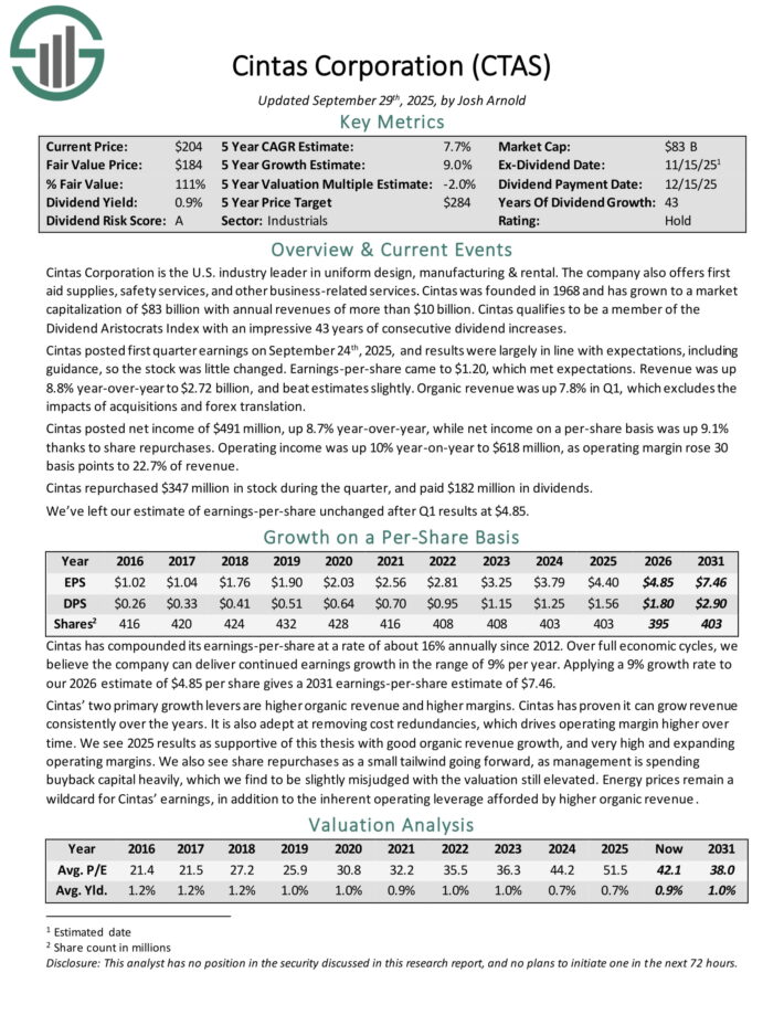 Click here to download our most recent Sure Analysis report on Cintas (preview of page 1 of 3 shown below):