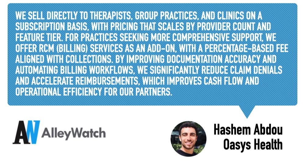Where do you see the company going now over the near term?In the near term, we’re focused on proving that AI can meaningfully improve therapist well-being and patient outcomes—not just efficiency. We’re rapidly emerging as the new infrastructure layer for modern behavioral health, and we want to become the most trusted AI-powered platform that clinicians rely on daily. We’ll continue expanding our network of health clinic partners, refining our product’s design and user experience, and strengthening our data integrations. We’re also investing heavily in Oasys Labs, our research and development arm, where we’re operationalizing predictive modeling to identify early indicators of mental health decline. Our momentum reflects a fundamental turning point for mental health care, where data and AI empower, rather than replace, clinicians.