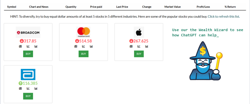 The new AI Wealth Wizard in Wall Street Survivor acts as a built-in portfolio assistant, helping users generate allocation ideas based on risk tolerance, diversification goals, and income preferences.
