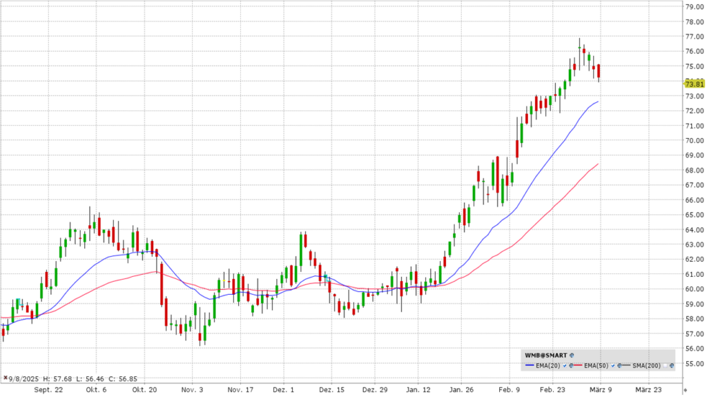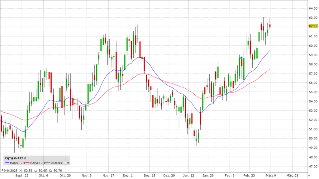 EQT ist der größte reine Erdgasproduzent in den USA. Der massive Ausbau von KI-Rechenzentren treibt den Strombedarf in den USA in ungeahnte Höhen. Da Wind und Sonne die Grundlast oft nicht decken können, wird Erdgas als Brückentechnologie unverzichtbar. Die Aktie profitiert direkt vom KI-Hype und der Energiewende-Infrastruktur. Die Aktie befindet sich in einem extrem kraftvollen und steilen Aufwärtstrend. Der Abstand zur 20-Tagelinie ist beachtlich. Das zeigt ein hohes kurzfristiges Momentum, birgt aber auch das Risiko einer kurzfristigen Überhitzung.