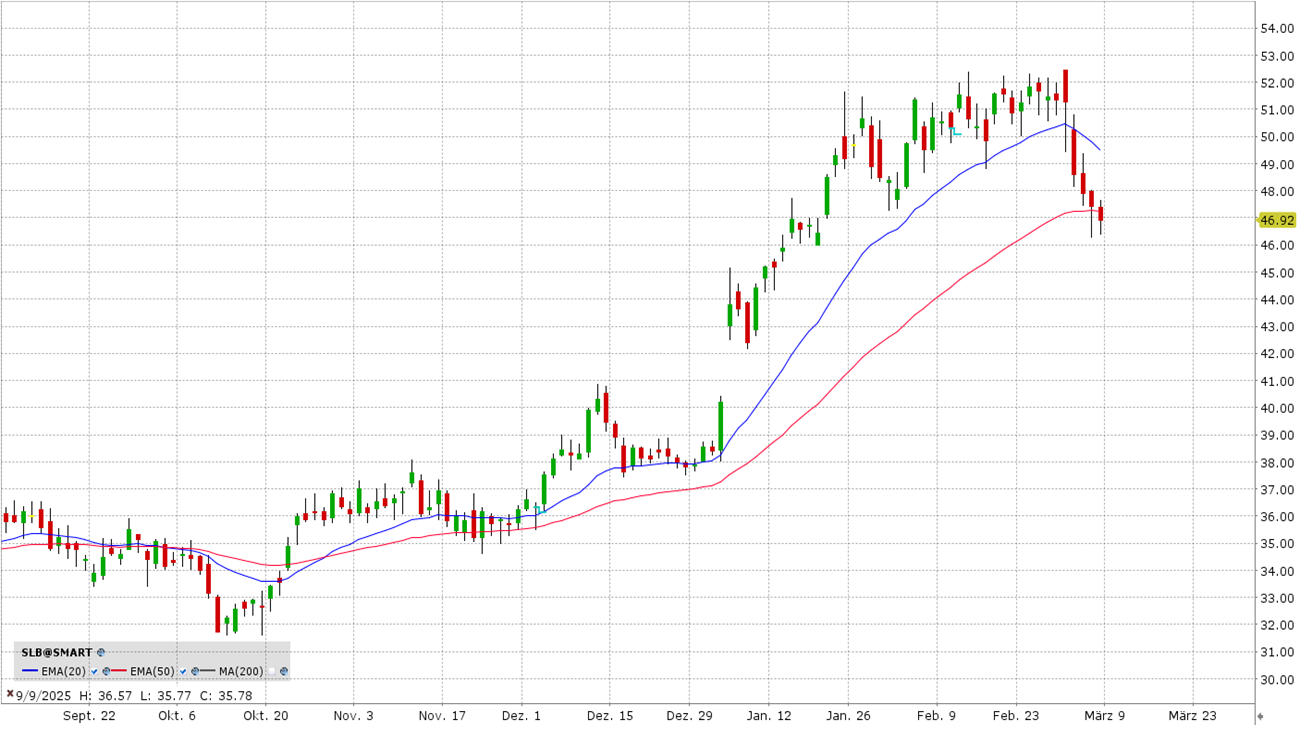 Abschließend werfen wir einen Blick auf Schlumberger (SLB), den weltweit führenden Technologiedienstleister für die Öl- und Gasindustrie. Während Firmen wie Exxon das Öl fördern, liefert SLB das „Gehirn“ und das Werkzeug dafür. SLB ist der Architekt, der Statiker, der Vermessungstechniker und derjenige, der die modernsten Smart-Home-Systeme installiert. Ohne SLB findet heute kaum noch eine effiziente Bohrung statt. Charttechnisch zeigt SLB aktuell ein deutlich schwaches Bild. Der EMA 50 bietet aktuell keinen Halt mehr, was charttechnisch ein kurzfristiges Verkaufssignal darstellt. Der nächste größere Halt liegt erst wieder im Bereich von 42 US-Dollar.
