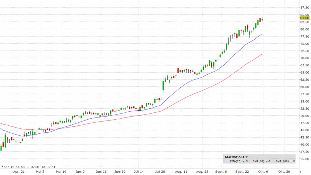 Corning ist ein US-amerikanisches, im S&P 500 gelistetes Unternehmen, das weltweit führend in der Spezialglas- und Keramikindustrie ist. In diesem Segment ist das wohl bekannteste Produkt angesiedelt: Corning Gorilla Glass. Dieses chemisch verstärkte Glas wird hauptsächlich für die Displays von Smartphones, Tablets und anderen elektronischen Geräten verwendet und ist bekannt für seine Kratzfestigkeit und Haltbarkeit. Die Aktie von Corning zeigte in jüngster Zeit eine bemerkenswerte positive Dynamik und erreichte neue 52-Wochen-Höchststände. Der Kursanstieg ist eine Kombination aus positiven Fundamentaldaten, optimistischen Zukunftsaussichten und technischer Stärke.