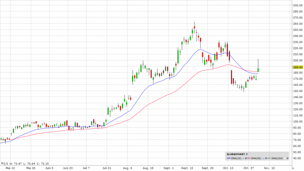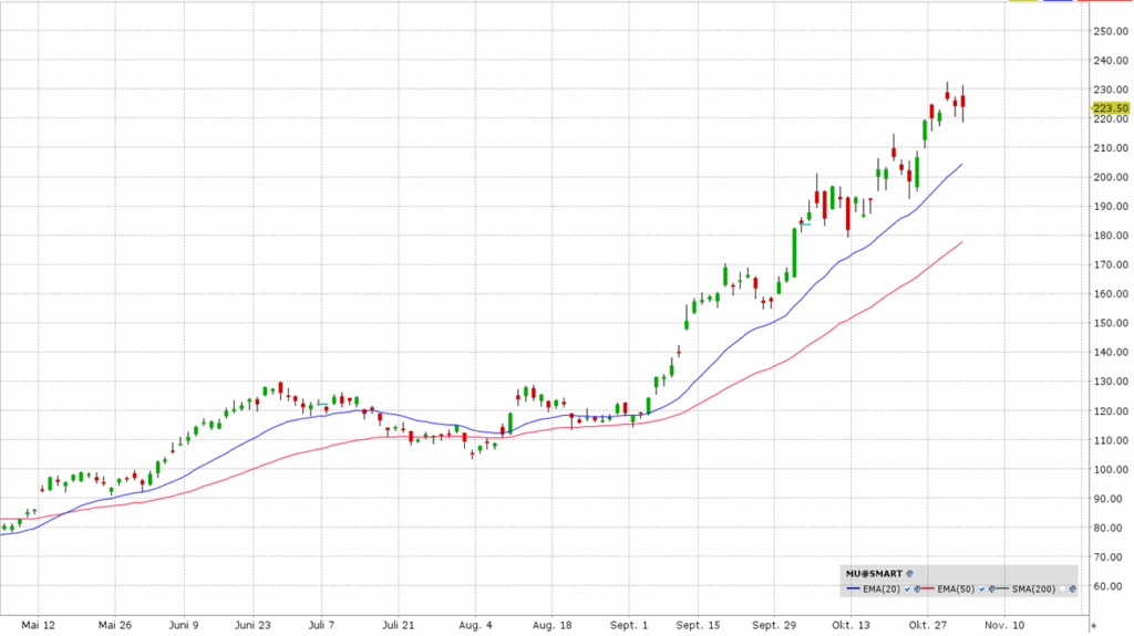 Micron übertraf im letzten Quartal die Umsatz- und Gewinnerwartungen deutlich und lieferte einen sehr optimistischen Ausblick, was den KI-Boom im Chip-Sektor befeuert. Besonders die Nachfrage nach High Bandwidth Memory (HBM) für KI-Anwendungen zeigt eine hohe Wachstumsdynamik, was die Umsatzqualität verbessert und die Abhängigkeit vom zyklischen Endkunden reduziert. Die Aktie hat in den letzten Wochen neue Allzeithochs erreicht und der mittelfristige Tech-Trend ist positiv. Analysten sehen aufgrund des Wachstumspotenzials weiterhin Aufwärtspotenzial und erhöhen die Kursziele (z.B. Citi auf 245 USD). Der große Abstand zur 50-Tagelinie erhöht allerdings das Risiko eines Rücksetzers.