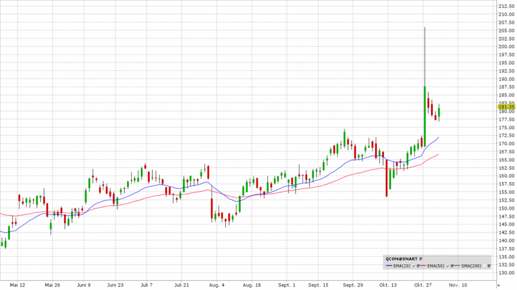 Qualcomm hat neue KI-Chips für Edge Computing vorgestellt, die als direkter Angriff auf Nvidias Dominanz im KI-Markt gesehen werden, woraufhin die Aktie stark anstieg. Die Chips der Snapdragon Digital Chassis Plattform treiben das wichtige Automobilsegment voran, mit neuen Partnerschaften (z.B. Mercedes-Benz, BMW, Google Cloud) und Fokus auf ADAS/autonomes Fahren. Die jüngsten Quartalszahlen übertrafen die Schätzungen bei Umsatz und Gewinn, obwohl der Ausblick für das Kerngeschäft (Handys) teilweise verhalten aufgenommen wurde. Qualcomm gilt als zuverlässiger Dividendenzahler und setzt weiterhin auf hohe Kapitalrückflüsse durch Dividenden und Aktienrückkäufe. Trotz regulatorischer Risiken (z.B. China-Untersuchung) und kurzfristiger Volatilität sehen Analysten auf längere Sicht Aufwärtspotenzial für den Halbleiter-Riesen (Mittleres Kursziel bei ca. 177 USD, „Kaufen“-Empfehlungen überwiegen). Charttechnisch sehen wir nach einem steilen Anstieg gerade einen Pullback.