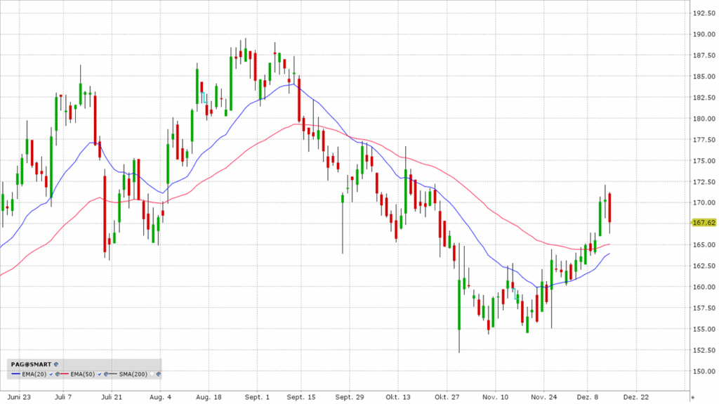 Die Penske Automotive Group ist ein diversifiziertes Transportdienstleistungsunternehmen (Autohäuser und Nutzfahrzeuge). Das Unternehmen lieferte im dritten Quartal 2025 leicht schwächere Zahlen als erwartet, verzeichnete jedoch weiterhin Umsatzsteigerungen auf vergleichbarer Fläche im Einzelhandelsgeschäft. Die Aktie konnte in den letzten Tagen den EMA 50 zurückerobern, was das bullische Bild seit den November-Tiefs untermauert.